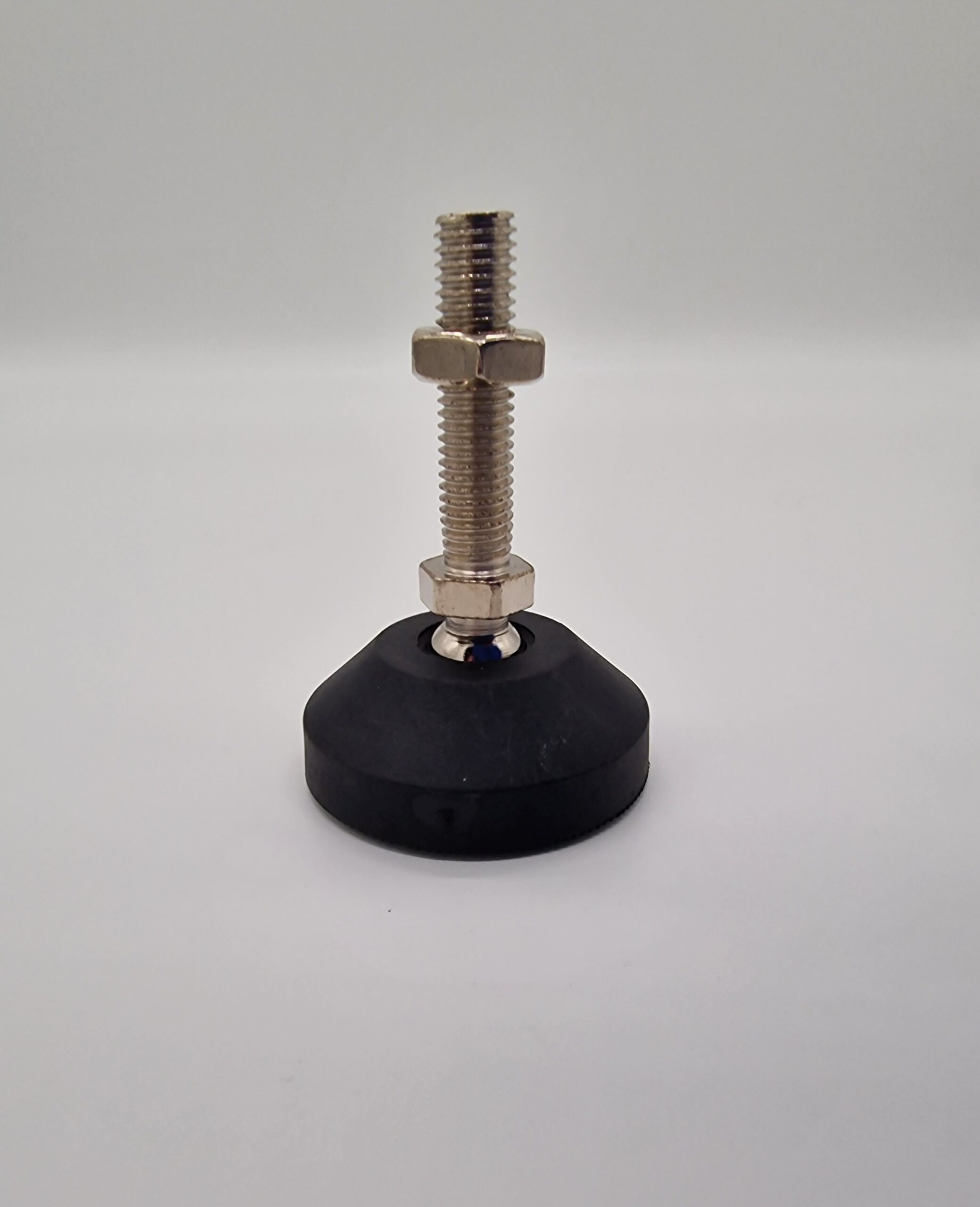 Höhenverstellbarer Kunststoff-Fuß Ø60mm mit Stoßdämpferkappe. Schraube aus verzinktem Stahl, M12, Länge 50mm. Für Maschinengestelle, Werkbänke oder Regale.